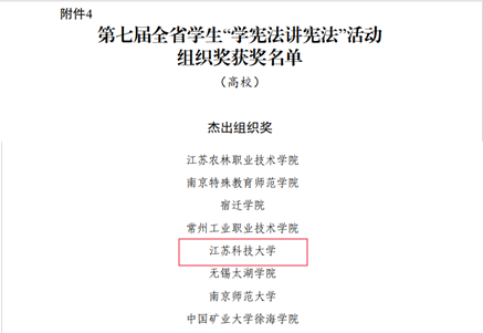 近日,省教育厅公布了第七届全省学生“学宪法讲宪法”活动评选结果(苏教法函〔2022〕11号),我校荣获高校组“杰出组织奖”。全省共35个单位(7个教育局、14所本科、14所高职高专院校)获“杰出组织奖”。
