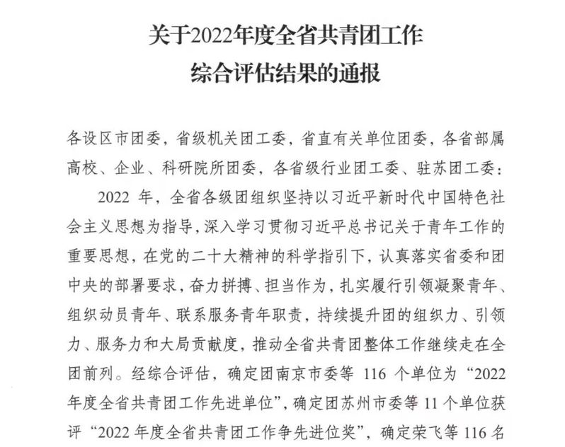 近日,共青团江苏省委印发《关于2022年度全省共青团工作综合评估结果的通报》(团苏委发〔2023〕3号),我校团委获评“2022年度全省共青团工作先进单位”,校团委副书记张冬冬同志获评“2022年度全省共青团工作先进工作者”。据悉,经综合评估,全省共有团南京市委等116个单位获评“2022年度全省共青团工作先进单位”,11个单位获评“2022年度全省共青团工作争先进位奖”,116名同志获评“2022年度全省共青团工作先进工作者”。