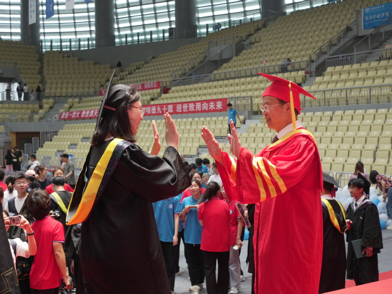 乐声渐弱,掌声雷动。导师们身着导师服上台站定,庄重的学位授予仪式正式开始。毕业生身穿学位服,依次上台领取学位证书,学位委员会全体导师为他们拨穗正冠、颁发学位证书并合影留念,学位授予仪式圆满完成。在亲友的搀扶下,一位拄着拐杖的毕业生上台接受拨穗,大家纷纷为他加油喝彩,毕业典礼“一个都不能少”的满满“仪式感”被推向高潮。台下,毕业生们与挚友相携、与父母相拥,合影留念,用相机定格美好的瞬间。