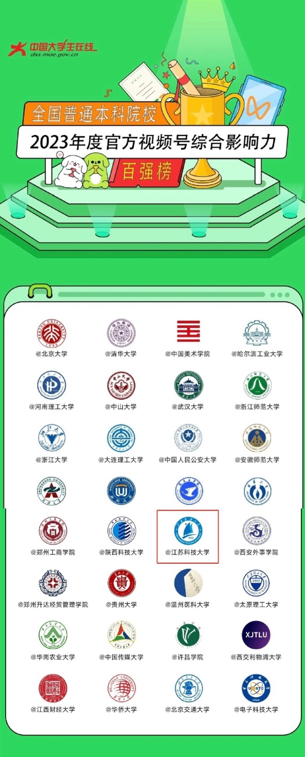 日前,教育部中国大学生在线联合微信官方发布2023年度全国高校官方视频号综合影响力榜单,乐鱼官方网页版官方视频号荣登全国本科院校2023年度官方视频号综合影响力百强榜。