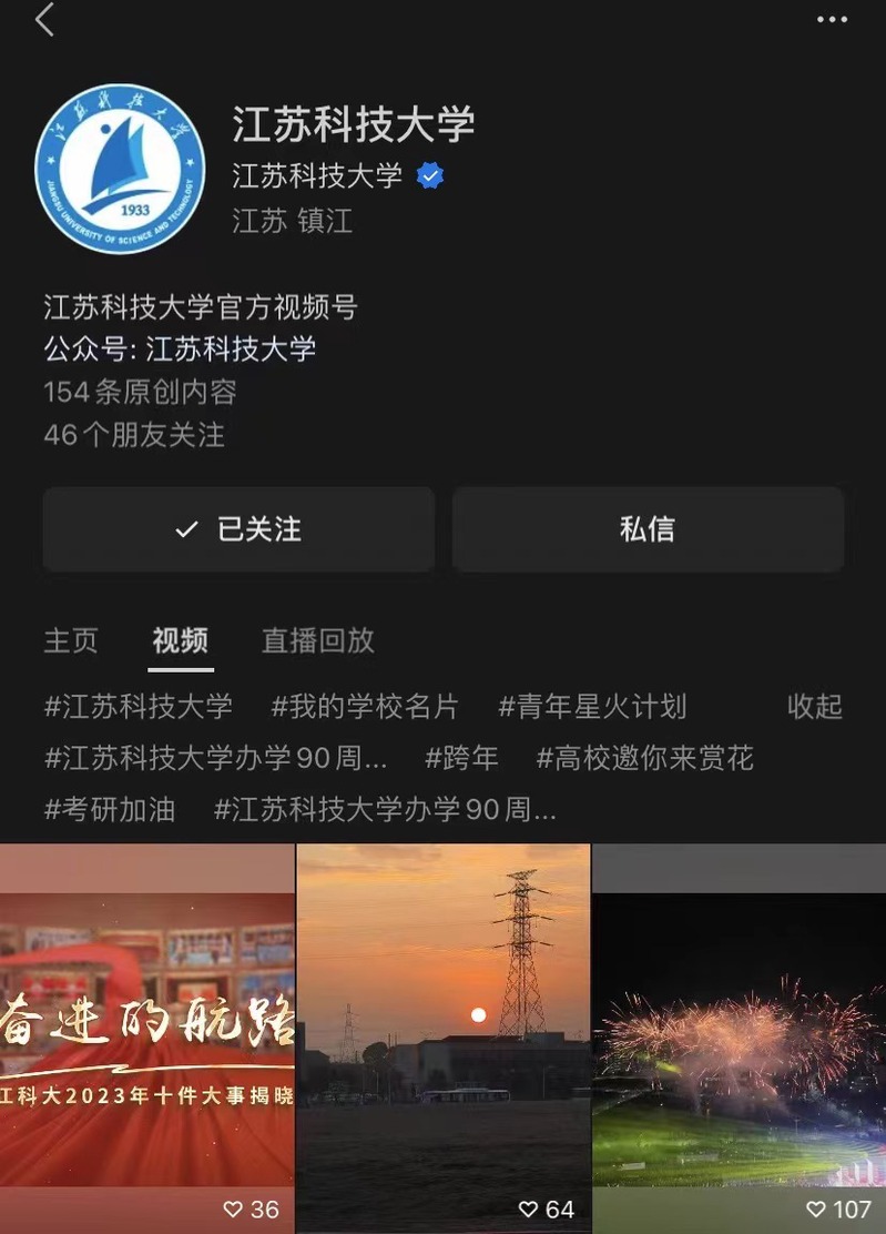 学校官方视频号坚持立德树人根本任务,以制作有思想、有温度、有品质的新媒体作品为目标,作品选题紧贴广大师生关注的时事热点和校园生活,以直观、生动、便捷的形式将学校党建思政、时政大事、校园文化生活等丰富呈现,展现江乐鱼官方网页版脚踏实地、逐浪前行的奋进姿态与师生昂扬向上、奋发有为的精神风貌。