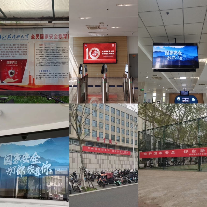 从4月12日起,安保处、宣传部通过校园宣传橱窗、电子屏、电视、展架、宣传单、横幅等不同载体,在校园主干道、食堂、宿舍、图书馆、教室等人群密集区,进行国家安全相关知识集中宣传。4月11日至4月15日,依托微信工作群、人武部“JUST国防”微信公众号以及QQ说说等载体连续5天发布“国家安全”系列宣传,掀起了线上线下、由点及面、多管齐下的学习宣传国家安全知识的活动热潮。