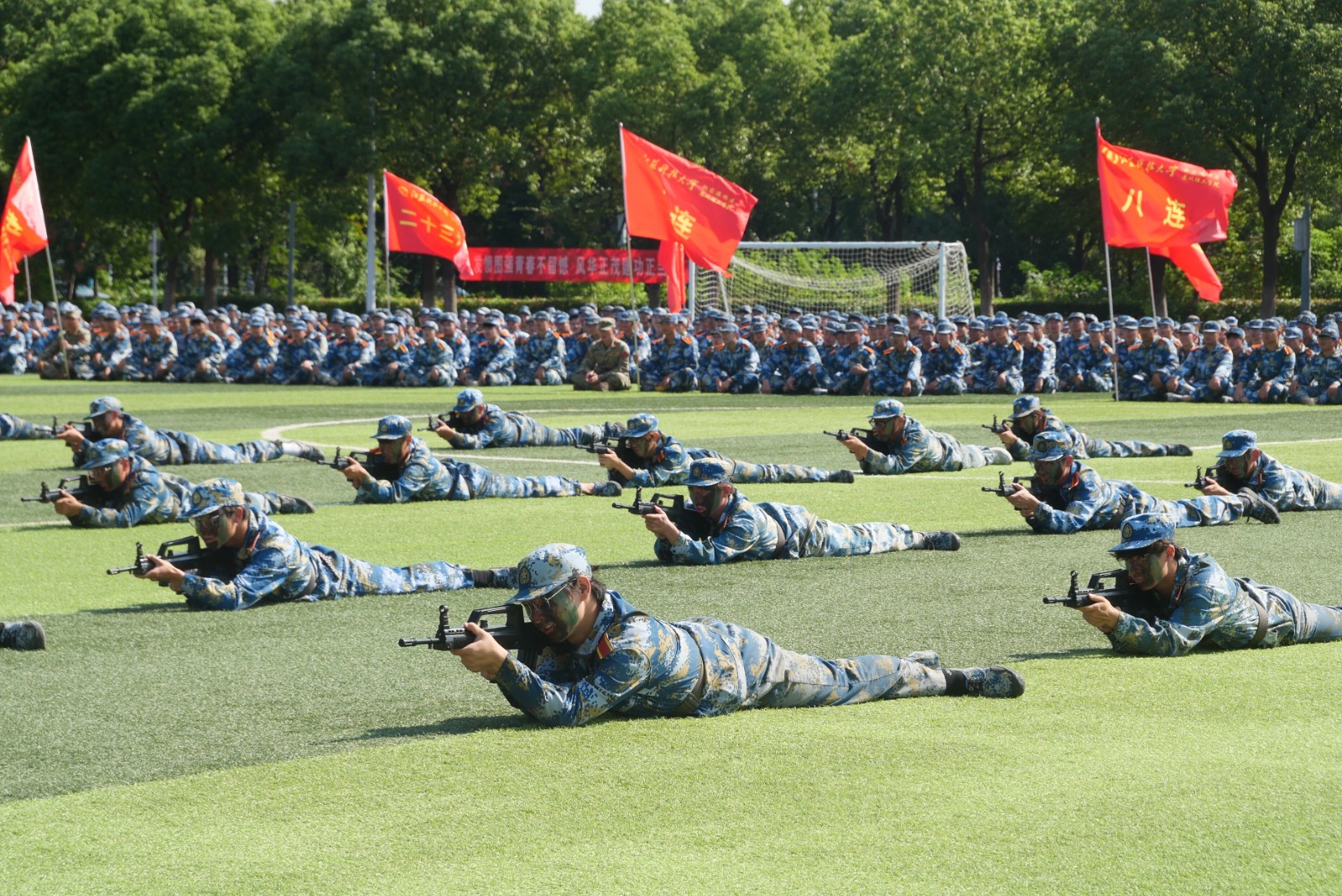 在嘹亮的军歌声中,参训新生进行了分列式、军体拳、擒拿拳、匕首操、刺杀操、战术协同等科目的表演。
