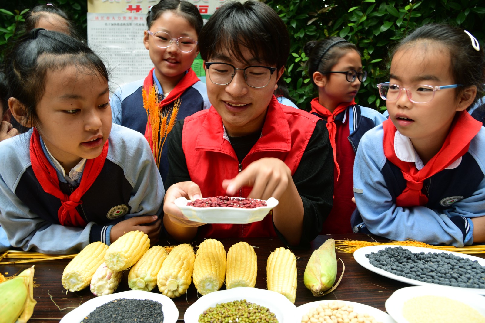 活动开始,志愿者们带来了一些玉米、红豆、大米、小米、花生、芝麻等粮食,孩子们兴奋地伸出小手,轻轻触摸着这些粮食,感受它们的形状和质地,志愿者们借此教导孩子们辨认这些粮食。随后,志愿者们带领小朋友们一起朗诵了《悯农》这首诗,并讲述了其中的故事,引导小朋友们在今后要节约粮食,不随便浪费,让爱惜粮食的种子在孩子们幼小的心灵中萌芽。