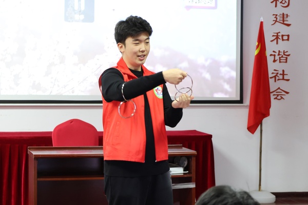 志愿者们深情演绎《万疆》,褚爷爷深受感染,主动上台献唱《再见了大别山》,其豪迈的歌声赢得了全场热烈的掌声。倪叔叔也为大家带来了精彩绝伦的口琴表演。92 岁高龄的郑教授也即兴登台,以一段充满激情的说唱表达了对活动的感激与对生活的热爱之情。歌曲表演结束后,精彩的魔术表演闪亮登场。扑克牌魔术师以其高超的技艺与风趣幽默的互动环节,令老人们目不暇接,惊叹声与欢笑声此起彼伏。其中,传统魔术四连环表演更是将现场气氛推向了又一个高潮,赢得了老人们的阵阵掌声与喝彩。