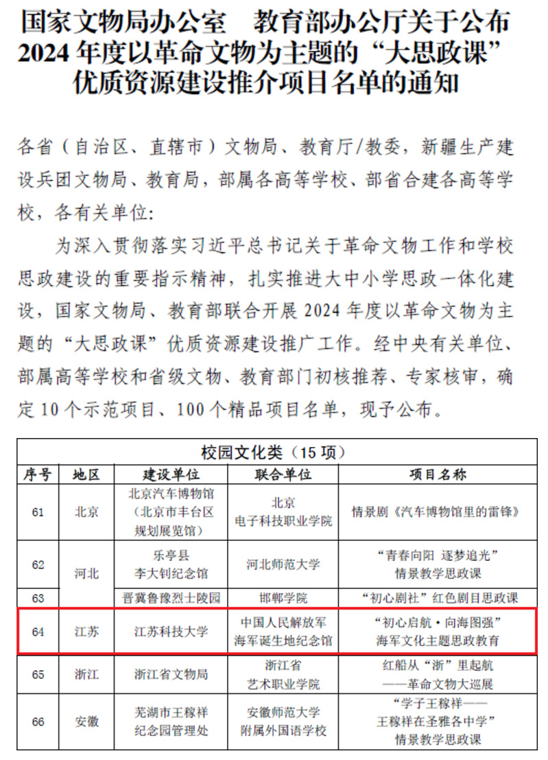 近日,由国家文物局和教育部联合开展的2024年度以革命文物为主题的“大思政课”优质资源建设推介活动公布结果,经中央有关单位、部属高等学校和省级文物、教育部门初核推荐、专家核审,在全国范围内遴选了10个示范项目和100个精品项目,其中江苏省获批6项精品项目。由我校联合中国人民解放军海军诞生地纪念馆(海纪馆)共同建设的“初心启航•向海图强”海军文化主题思政教育入选校园文化类精品项目,这也是我省获得的唯一一项校园文化类精品项目。