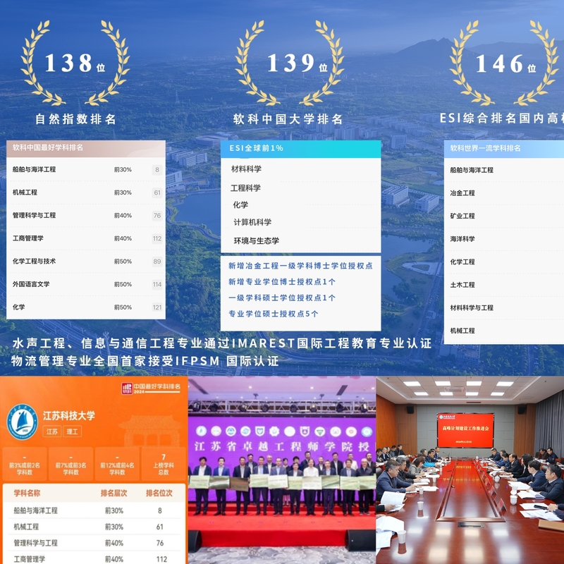 坚持学科建设龙头地位,全力推进学科攀峰工程,学科水平和综合实力显著提升。2024年,新增冶金工程一级学科博士学位授权点,填补江苏高校该学科博士点空白;新增专业学位博士授权点1个,实现专业学位博士点零的突破。新增一级学科硕士学位授权点1个,专业学位硕士授权点5个,人才培养口径进一步拓宽。7个学科入选“软科中国最好学科”榜单,其中船舶与海洋工程学科位居全国第8。获批江苏省卓越工程师学院,新增“计算机科学”与“环境科学与生态学”2个学科进入ESI全球排名前1%,国际学术影响力持续提升。