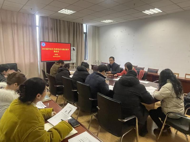 开学第一周,理学院在文理大楼1244召开2025届毕业生考研复试与就业指导推进会,院长戴俊、党委副书记周志辉,各系部主任、毕业班班主任、辅导员共同研讨进一步加强毕业生考研复试与就业指导工作。与会人员深入分析当前考研就业形势、各专业特点和学生个性化需求,会议强调要充分发挥辅导员、班主任的引领作用,通过定期摸排学生动态、分类跟踪辅导等方式,为学生提供针对性支持,构建“复试冲刺+就业提质”双轨并行的服务体系,确保学生上岸有路、求职有门。