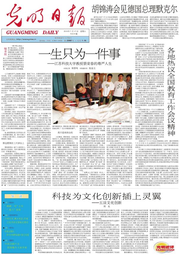 2010年7月17日《光明日报》报道景荣春教授事迹