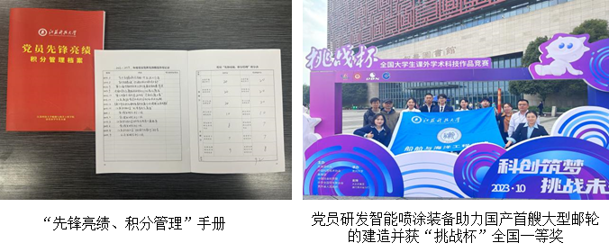 党支部作为镇江市党员“先锋亮绩、积分管理”首批试点单位和先进单位,结合大学生人才培养目标制定基础积分和贡献积分,以积分激励党员。党员设计研发智能喷涂装备,为国产首艘大型邮轮的建造和维修提供技术保障,项目获“挑战杯”竞赛全国二等奖。