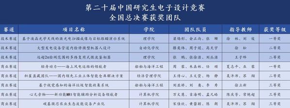 在全国总决赛中,8支队伍经过项目路演和封闭答辩,技术赛中获全国一等奖1项、二等奖2项,商业赛中获全国一等奖1项、二等奖1项、三等奖3项。
