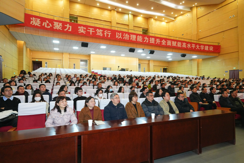 校党委书记杨建新代表党委常委会作《凝心聚力实干笃行以治理能力提升全面赋能高水平大学建设》工作报告,简要回顾过去一年工作,并对做好2026年工作提出三点意见:一是知势谋势乘势,以战略主动赢得发展先机;二是强化治理引擎,以群策群力推动事业发展;三是恪守责任,以从严从实作风保障工作开展。并就开展树立和践行正确政绩观学习教育、党建双促双融、专项整改整治、十五五规划编制、守牢安全稳定底线等工作提出要求。