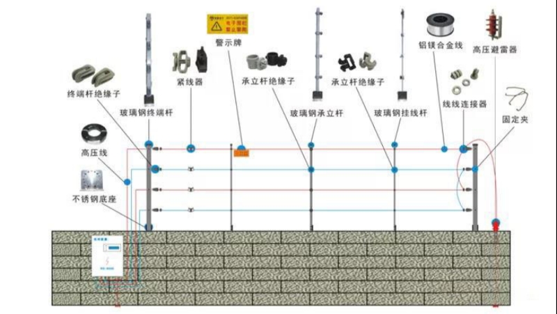 由四根平行设置的特制的裸铝合金线构成,由围栏控制器输出脉冲高压或低压构成电网,即组成电子围栏部分。