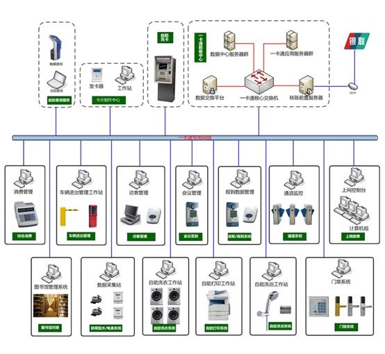非接触式智能卡“一卡通”管理系统(简称一卡通)是信息技术、电子通讯技术发展的产物,是实现物业管理、安全防范管理的有效措施,该系统在使用时,卡片不与设备直接接触,只需在设备前晃动,系统即可采集到所需信息,实现门禁、考勤、停车场管理、POS餐饮消费管理等诸多功能。因其高度安全、适用面广、极为方便的使用和管理方式,被广泛应用于银行、宾馆、高档写字楼、智能化小区、工厂等重要场所。该系统已成为楼宇弱电系统的重要组成部分,也是楼宇实现现代化管理的重要标志。